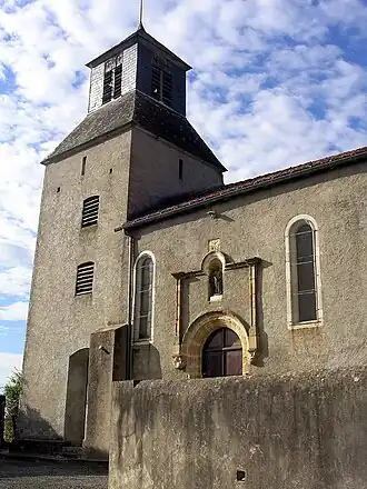 - Kirche, gewidmet dem Apostel Simon Petrus. Sie war in ihren Ursprüngen als Kapelle des Schlosses von Athos im 13. Jahrhundert im romanischen Stil erbaut. Das Gebäude hat einen schlichten, rechteckigen Grundriss mit einem Tonnengewölbe und einer halbrunden Apsis. Im 16. Jahrhundert ist die Kirche wiederaufgebaut worden. Von der ursprünglichen Bausubstanz sind einige Sandsteinblöcke im Fundament der Apsis und eine niedrige Rundbogentür an der Nordseite übrig geblieben. Bei diesem Bauprojekt sind Elemente des Renaissance-Stils eingearbeitet worden, was an der Tür an der Südseite deutlich abzulesen ist. Die Blende des Rundbogens und die Einrahmung aus Sandstein oberhalb der Tür sind gotische Verzierungen und gelten als Spolie, d. h. Wiederverwendung von älteren Bauteilen. Eine Pilgermuschel als Hintergrund einer Statue durchbricht die obere Einrahmung. Über dieser Verzierung ist ein Christusmonogramm in die Mauer eingefasst, ebenfalls eine Spolie.[8] Der Chor im Innenraum ist mit Täfelung verkleidet. Die Glasfenster zeigen leuchtende Farben, vorwiegend Rottöne, und wurden im 20. Jahrhundert hinzugefügt.[9]