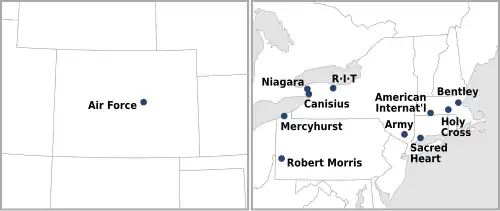 1 Robert Morris war von 2010 bis zur Schließung der Herren- und Damen-Eishockeymannschaften nach der Saison 2020–21 Mitglied. Beide Mannschaften wurden im Juli 2023 wieder aufgenommen, und die Herrenmannschaft trat zu diesem Zeitpunkt wieder der Atlantic Hockey Association bei.