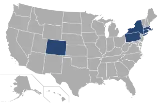 | Bundesstaaten | 5 – Colorado, Connecticut, Massachusetts, New York, Pennsylvania |
