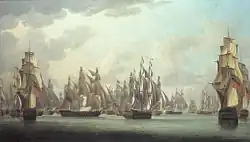 - ↑ britische Linienschiffe zweiten Ranges hatten in der Regel 90 bis 98 Kanonen.