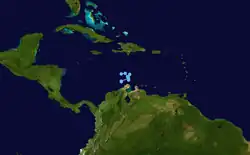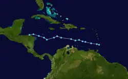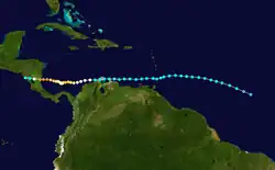 Am 10. Oktober bildete sich aus einer Störung in der innertropischen Konvergenzzone das siebzehnte tropische Tiefdruckgebiet der Saison. In den folgenden zwei Tagen wanderte das System nach Nordwesten und verstärkte sich zum Tropischen Sturm Joan.[45] Nachdem Joan über die Kleinen Antillen hinweggezogen war, wanderte der Sturm an der Küste Südamerikas entlang. Er überquerte am 17. Oktober die Guajira-Halbinsel und erreicht dann nur 50 km vor der Küste liegend schnell Hurrikanstärke. Am 19. Oktober war Joan zu einem schweren Hurrikan geworden, der weiter nach Westen zog.[46] Kurz vor dem Landfall bei Bluefields in Nicaragua am 22. Oktober als ein Hurrikan der Kategorie vier erreichte Joan ihre größte Stärke. Joan war der am weitesten im Süden verlaufende Hurrikan, der bis dahin aufgezeichnet wurde. Dieser Rekord wurde später durch Hurrikan Ivan gebrochen.[47] Joan blieb beim Überqueren Nicaraguas gut organisiert und gelangte in den östlichen Pazifik in der Stärke eines tropischen Sturmes. Dort erhielt Joan den Namen Tropischer Sturm Miriam. Miriam verlor jedoch stetig an Stärke und löste sich am 2. November auf.