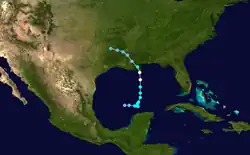 Ein von einer Kaltfront begleitetes Wolkenband gelangte am 4. September von Texas aus in den Golf von Mexiko. Dieses Wolkenband teilte sich über dem mittleren Golf und die nördliche Hälfte entwickelte sich in eine Front, die nordostwärts wanderte.[31] Die Konvektion über der südlichen, bis dahin stationären Hälfte nahm zu und legte sich um das Zentrum des Wolkenbandes. Am 7. September bildete sich eine oberflächennahe Zirkulation und die Ausgabe von Sturmwarnungen begann an diesem Tag.