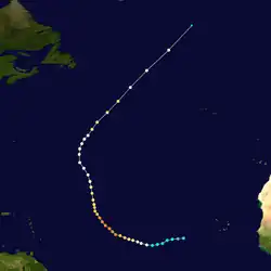 Am 2. September entwickelte sich bei Bermuda aus einer Gewitterzone mit einer nordwestwärts ziehenden tropischen Welle ein oberflächennahes Tiefdruckgebiet. Dieses blieb zunächst schlecht definiert und konnte sich nicht mit der Konvektion verbinden, wurde am 3. September dennoch zum tropischen Tiefdruckgebiet.[27] Unter Einfluss der Westwindzone beschleunigte sich die Vorwärtsgeschwindigkeit nordostwärts auf 80 km/h. Am Abend des 3. Septembers wurde das System zum Tropischen Sturm Ernesto erklärt. Ernesto nahm an Intensität zu, auch nachdem das System die tropischen Eigenschaften verloren hatte.[28] Ernesto wurde am 5. September durch eine größere außertropische Zyklone absorbiert.