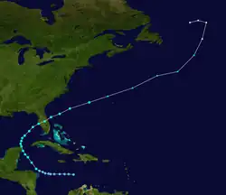 Am 24. August erhöhte sich die Vorwärtsgeschwindigkeiten auf 25 km/h und die Zugrichtung drehte nach Westen. Kühles Wasser schwächte das System am 26. August zu einer tropischen Welle ab. Diese zog weiter in west-nordwest licher Richtung, ohne das Aussichten auf ein Wiedererstarken bestanden,[19] trotzdem entwickelte sich das Resttief am 30. August etwa 290 km südöstlich der Küste North Carolinas wieder zu einem Tiefdruckgebiet und das Büro Washington des National Weather Service verfolgte das System als Sturmzentrum, bis es sich am 1. September in die Frontalzone eingegliederte.