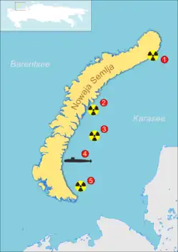 - ↑ a b über das Sinken der K-159, mit Karte der verklappten Reaktoren in der Region um Nowaja Semlja. In: news.bbc.co.uk. BBC News, abgerufen am 28. Februar 2025 (englisch).