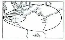 Bereits der Einsatz einer einzigen Wasserstoffbombe, im Bild 20 Mt (mehr als tausendfache Sprengkraft der Hiroshima-Bombe) auf Hamburg, kann je nach Windrichtung Flächen mehrerer Länder kontaminieren.