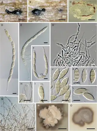 Die Nebenfruchtform ist, wenn vorhanden, hyphomycetisch. Die Kolonien sind dunkelbraun bis schwarz, eben und glatt. Die Konidienträger entstehen aus nur einer einzelnen Hyphe (mononematös) und ihre Hyphen sind deutlich größer als normale Hyphen (mikronematös) oder halb-makronematös (in dem Fall sind die Hyphen größer). Sie sind septiert, verzweigt oder unverzweigt, gerade oder gewunden. Sie sind durchscheinend, werden bei Reife aber braun. Die konidiogenen Zellen sind holoblastisch, d. h. sie werden als Ganzes nach der Bildung abgeschnürt. Sie sind tonnenförmig und zylindrisch. Die Konidien sind braun, mauerförmig, unregelmäßig kugelig.[1]