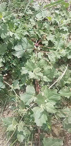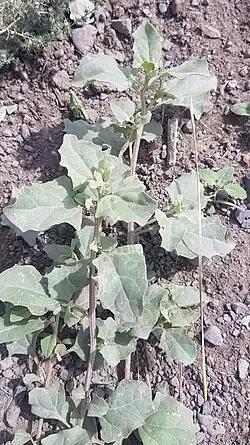 Die oberseits (grau-)grünen, unterseits dicht mit Blasenhaaren besetzten und dadurch grau-weißen Laubblätter besitzen einen 3 bis 6 mm langen Blattstiel (Bei Pflanzen im Gebirge kommen zusätzlich auch dunkelfarbige Blasenhaare vor). Ihre Blattspreite ist bei einer Länge von 3 bis 5 cm und einer Breite von 1,5 bis 3 cm rhombisch oder rhombisch-dreieckig bis eiförmig-dreieckig, an der Basis abgerundet oder breit keilförmig. Der Blattrand ist ganzrandig oder etwas buchtig gezähnt, mit einem größeren basalen Zahnpaar.