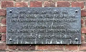 - ↑ Karl Kiehne: Das Flammenwerferattentat in Köln-Volkhoven, S. 65.