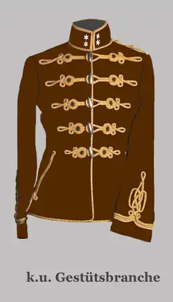 Attila eines Korporals der k.u. Gestütsbranche. Auf dem Unterärmel eine Vitéz Kötés