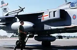 Kampfflugzeug Jaguar mit abwerfbarem Zusatztank am inneren Flügelaufhängepunkt, Aufklärungsbehälter unter dem Rumpf, sowie einer seltenen Überflügel-Lenkwaffe
