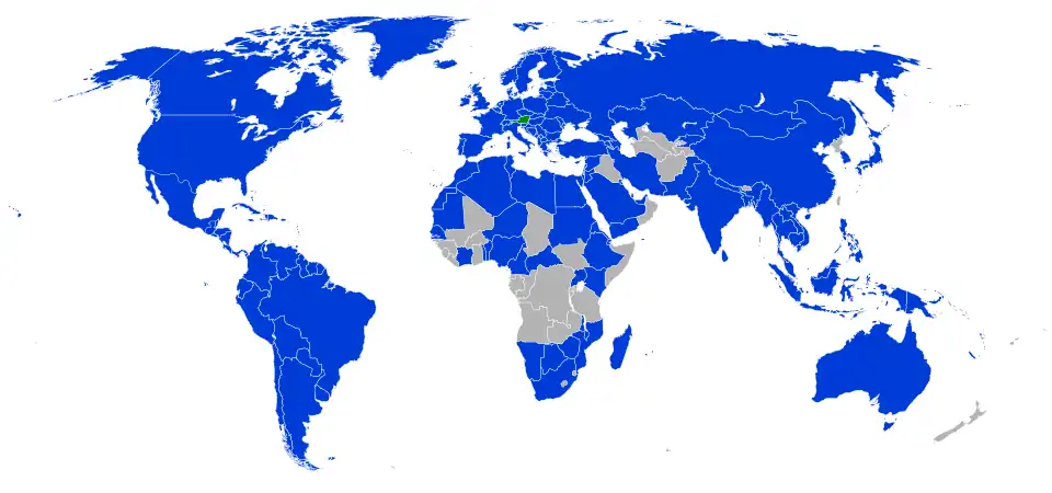 Blau: diplomatische Vertretungen Österreichs (Anwesenheit einer Botschaft, eines Konsulats oder eines Honorarkonsulats) Grün: Österreich. Grau: Fehlende diplomatische Beziehungen