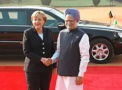 Während des Kalten Krieges unterhielt Indien diplomatische Beziehungen sowohl zur Bundesrepublik Deutschland als auch zur DDR. Seit dem Fall der Berliner Mauer und der Wiedervereinigung Deutschlands haben sich die Beziehungen weiter verbessert. Nach 1990 wuchs das Handelsvolumen zwischen beiden Ländern stark an und im Jahre 2001 vereinbarten beide Länder eine strategische Partnerschaft.[20] Seit 2011 kommt es zu regelmäßigen deutsch-indischen Regierungskonsultationen auf der Ministerebene.[21] Für Indien ist Deutschland der größte Handelspartner in Europa und beide Länder kooperieren eng bei Themen von beidseitigem Interesse wie der Klimapolitik. Beide unterstützen sich auch gegenseitig, jeweils einen permanenten Sitz im UN-Sicherheitsrat zu erhalten.
