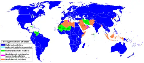 Derzeit unterhält Israel diplomatische Beziehungen zu 162 der 192 übrigen Mitgliedsländer der Vereinten Nationen.[2] Davon erneuerte oder nahm es 32 nach der Konferenz von Madrid (1991) und 32 nach Unterzeichnung des Gaza-Jericho-Abkommens (1994) auf.[2] Zu 28 Staaten hat Israel keine diplomatischen Beziehungen. In der westlichen Hemisphäre pflegen nur Kuba, Venezuela und Bolivien keine diplomatischen Beziehungen zu Israel, da die Regierungen dieser Staaten mit den Palästinensern sympathisieren. In Ostasien verweigert Nordkorea dem Land die Aufnahme diplomatischer Beziehungen, während die gegenseitige Nichtanerkennung Taiwans auf der Ein-China-Politik der Volksrepublik beruht. Bhutan pflegt traditionell restriktive Außenbeziehungen, hat Israel im Dezember 2020 diplomatisch anerkannt[3]. Ghana unterhält gute Beziehungen zu Israel.