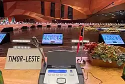 Osttimor gehört seit dem 24. Februar 2003 zur Bewegung der Blockfreien Staaten. Als Beobachter nahm Osttimor am dritten Gipfel der AKP-Staaten im Juli 2002 und ist inzwischen auch Mitglied.[28] Beim Pacific Islands Forum ist Osttimor ein assoziiertes Mitglied und nahm bereits seit August 2002 an den jährlichen Treffen der Staats- und Regierungschefs teil. Seit 2010 hat Osttimor Beobachterstatus bei der Melanesian Spearhead Group und 2016 trat Osttimor dem Pacific Islands Development Forum bei.[29] Auch bei der Gruppe der 77 ist Osttimor Mitglied. Bei der Internationalen Arbeitsorganisation (ILO) ist Osttimor seit dem 19. August 2003 Mitglied.[30] Am 25. April 2022 ratifizierte das Nationalparlament Osttimors den Atomwaffensperrvertrag.[31]