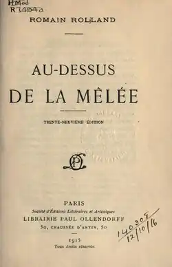 - Romain Rolland: Au-dessus de la mêlée, Paris, Librairie Paul Ollendorff, 1915, 163 S. (Wikisource).