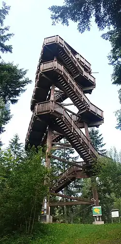 Der derzeitige Aussichtsturm mit einer Höhe von 27,55 Meter wurde am 11. Oktober 1992 nach vierteljährlicher Bauzeit feierlich eröffnet. 130 Stufen führen auf die 23,4 Meter hoch gelegene überdachte Aussichtsplattform.[1]