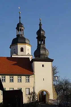 - Evangelische Pfarrkirche St. Johannes: Der kleine Turm ist ein Überbleibsel einer ehemaligen Kirchenburganlage.