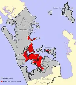 | Der Auckland Council wurde am 1. November 2010 aus den Städten Auckland City, North Shore City, Waitakere City, Manukau City und den Distrikten Papakura District, Franklin District und Rodney District neu gebildet. | |