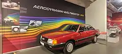 Aerodynamik-Weltmeister (auch: cw-Weltmeister) ist eine anfangs von Motorjournalisten geprägte und später von Audi für deren Pressearbeit übernommene[27] Bezeichnung für das Erreichen eines besonders niedrigen Luftwiderstandsbeiwertes (cw) für ein bestimmtes Fahrzeugmodell, die seit der Markteinführung des besonders strömungsgünstigen Fahrzeugmodells Audi 100 C3 im Jahr 1982 verwendet wird.[28] Der Luftwiderstandsbeiwert liegt dabei im Fokus der Presse und Fahrzeughersteller, um eine besonders gute Wirtschaftlichkeit oder Akustik eines neu entwickelten Fahrzeugmodells zu belegen.[29] Der Durchschnitts-cw-Wert aller in Europa gebauten Autos lag 1982 bei über 0,4. Eine Verbesserung des cw-Wertes um zehn Prozent bringt (bei gleicher Querschnittsfläche) eine Benzineinsparung von etwa vier Prozent.[30] Zwischenzeitlich wurde die Bezeichnung von Motorjournalisten für den Opel Kadett E[31] und Opel Calibra[32][33] verwendet. Seit 2012 wird die Bezeichnung von Mercedes für die Modelle Mercedes CLA[34][35] und Mercedes A-Klasse[36] verwendet. Von Dezember 2023 bis Juni 2024 wurde ein Audi 100 C3 im Rahmen der Sonderausstellung „Form vollendet“ im August Horch Museum in Zwickau ausgestellt.[37]