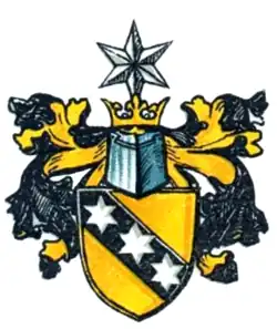 In Gold ein mit drei silbernen Sternen belegter schwarzer Schrägbalken. Auf dem gekrönten Helm ein silberner Stern.