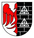 Blasonierung: „Im Wellenschnitt gespalten, rechts in Silber ein halber gestümmelter roter Adler am Spalt, links in schwarzem, silbern gefugtem Mauerwerk pfahlweise zwei silberne Fachwerkgiebel.“