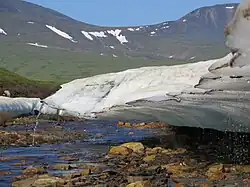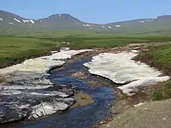 Aufeis nennt man Ablagerungen von geschichtetem Eis, die durch das Gefrieren von aufeinanderfolgenden Wasseraustritten entstehen.