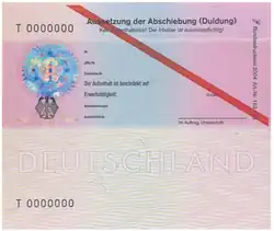 Die schwächste Form des Aufenthaltsstatus in Deutschland sind Duldungen. Eine ausgestellte Duldung begründet kein Aufenthaltsrecht, sondern stellt nur den behördlichen Nachweis der vorübergehenden Aussetzung der Abschiebung dar. Der Betroffene bleibt ausreisepflichtig (§ 60a Abs. 3 AufenthG); die Ausreisepflicht wird aber nicht durch Abschiebung vollzogen. Trotz fehlender Rechtmäßigkeit des Aufenthalts ist der Aufenthalt damit nicht strafbar.
