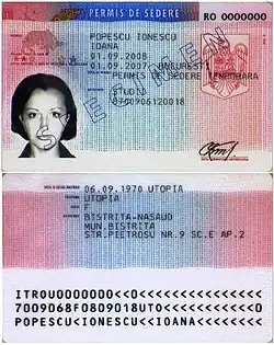 - PERMIS DE ȘEDERE (Aufenthaltserlaubnis) – tipul de permis (Art der Erlaubnis): REZIDENT PE TERMEN LUNG CE (Erlaubnis zum Daueraufenthalt — EG); dieses Dokument wurde seit 2007 Ausländern ausgestellt, denen eine langfristige Aufenthaltsberechtigung gewährt oder verlängert wurde und hat eine Gültigkeitsdauer von fünf (Regelfall) bis zehn Jahren (für Familienangehörige rumänischer Bürger). Unter „Observații“ (Bemerkungen) wird die dem Ausländer zugewiesene persönliche Kennnummer eingetragen.[8]