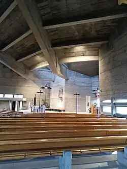 Das Gestühl im Inneren ist radial in drei Blöcken angeordnet, die auf den zentralen Altar gerichtet sind. Die Anordnung wurde durch die Reformen des Zweiten Vatikanischen Konzils geprägt, durch welche unter anderem die die strikte Trennung zwischen Altarraum und Gemeinde infrage gestellt wurde. Ebenso wurden drei gleichwertige Eingänge zum Kirchenraum anstelle eines Hauptportals und Nebeneingängen geschaffen.[3]