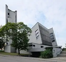 Architektonisch ist der Kirchanbau in mehrere schräg abfallende Baukörper gegliedert, die zusammen eine zeltartige Struktur bilden, wobei der Altarraum die niedrigste Dachhöhe aufweist. Sie erzeugen zusammen den Eindruck eines einstürzenden Gebäudes, das vom Turm gestützt wird[1][2] oder auch einer Verneigung des Daches vor der Gegenwart Christi.[3] Der 33 m hohe, freistehende Turm ist aus Schalensegmenten und Zylindern aufgebaut. Die Fassade wurde ebenso wie der Innenraum vollständig in Sichtbeton ausgeführt, wobei die Außenfassade bei einer Renovierung in den Jahren 1999 und 2000 mit einem Putz versehen wurde.