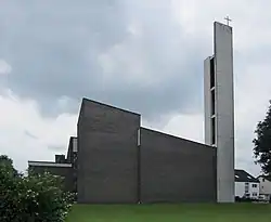 Die Kirche erhebt sich über einem fast quadratischen Grundriss mit diagonaler Ausrichtung. Darüber erhebt sich ein Pultdach, welches zum Altarraum ansteigt. Die dortige Außenecke ist leicht nach innen verschoben. Über dem Altarraum hebt sich das Dach von der restlichen Fläche durch einen Versatz ab. Im Versatz beleuchten sieben rechteckige Öffnungen den ansonsten fensterlosen Altarraum. Die Kirche ist von außen verklinkert. Gegenüber dem Turm ist an die Kirche eine Werktagskapelle angegliedert.