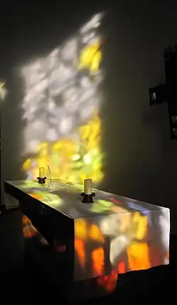 An der Wand hinter dem Altar hängt als Zentralpunkt des Raumes heute ein Altarkreuz. Es ist mit Bergkristallen und Glaselementen geschmückt. Ein Pult nimmt das Lektionar auf und auf dem Osterleuchter wird von Ostern bis Christi Himmelfahrt die Osterkerze entzündet.