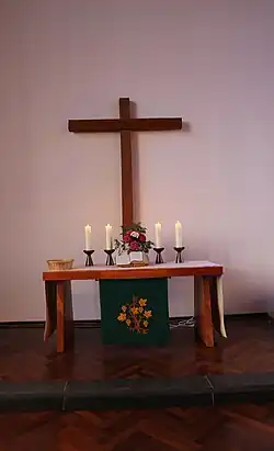 Das Innere des Kirchenraumes hat durch die Abtrennung von Vorhalle und Sakristei fast Zentralraumcharakter. Die Bänke sind schräg zueinander auf den Altar ausgerichtet und fassen ca. 200 bis 240 Personen. Altartisch, Predigtpult und Taufgefäßständer sind in einfachsten Formen in Kiefernholz aufgeführt. An der Altarwand hängt ein großes Altarkreuz aus Eichenholzbalken.