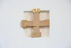 Unmittelbar vor dem Zugang zur Kirche und zum Pfarreizentrum ist im Boden ein Dreieck aus Kupfer eingelassen, das selber wiederum aus drei Dreiecken besteht, was auf die Trinität verweist. Auf dieser dreieckigen Bodenplatte wird in der Osternacht das Osterfeuer entzündet, welches das von Gott neu geschenkte Leben symbolisiert. Das Dreieck kann auch als Pfeil verstanden werden, der auf das Portal der Kirche verweist.