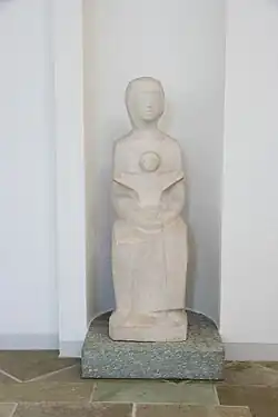 Auf der rechten Seite der Kirche befindet sich eine sitzende Maria mit Jesuskind, welche Alois Spichtig aus Holz gefertigt und weiss gefasst hat. Das Jesuskind breitet seine Arme aus und verweist damit auf die Liebe Gottes zu den Menschen. In der Kirchenwand vorne rechts ist der Grundstein der Kirche eingelassen, welcher aus bautechnischen Gründen zweigeteilt wurde und auch an der äusseren Kirchenwand sichtbar ist. Sowohl der Grundstein als auch der Sockel für die Marienstatue wurden aus dem gleichen Stein wie der Taufstein und das Weihwasserbecken gefertigt.