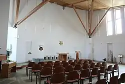 Für Gottesdienste mit vielen Kirchenbesuchern besteht die Möglichkeit, die Rückwand der Kirche zum Saal zu öffnen, damit der Kirchenraum vergrössert werden kann. Durch die Übernahme der Formensprache und der Materialien von der Kirche zum Saal wirkt die Kirche auch bei geöffneter Rückwand als räumliche Einheit.