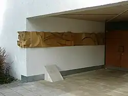 Zusammen mit einem Töpfer hat Alois Spichtig ein vier Meter langes Relief aus gebranntem Ton geschaffen. In Symbolen erzählt es den Lebensweg von Maria Magdalena und thematisiert zudem fünf Dimensionen aus dem Leben der Heiligen: das Dämonische, die innere Zerrissenheit und das Erlösende, das Handelnde und das Bezeugende.[13] Das Relief beginnt links aussen, wo als erstes das Chaotische im Leben der Maria Magdalena dargestellt wird, die sieben Dämonen, welche von Jesus ausgetrieben wurden. Danach folgt die für den weiteren Lebensweg der Maria Magdalena entscheidende Begegnung mit Jesus: Gezeigt wird das ausgegossene Öl, mit dem sie Jesus salbt. Der daran anschliessende Lebensweg von Maria Magdalena mit Jesus wird als harmonisch und fliessend dargestellt und bildet einen Gegensatz zum Anfang des Reliefs auf der linken Seite. Der gemeinsame Lebensweg von Jesus und Maria Magdalena führt zum Kreuz, das im Relief als Nächstes folgt. Der Tod von Jesus Christus bedeutet für das Leben der Maria Magdalena eine Zäsur und hinterlässt eine Leere, welche rechts vom Kreuz im Relief auch optisch dargestellt wird. Daneben ist das Grab Jesu zu erkennen, vor dem sich der Rundstein befindet, welcher das Grab verschliesst. Oberhalb des Grabsteines ist die Inschrift Maria zu lesen. Das letzte Motiv auf dem Relief symbolisiert die Auferstehung Jesu und verweist mit der nach oben geöffneten Darstellung auf den Himmel, auf die Transzendenz.
