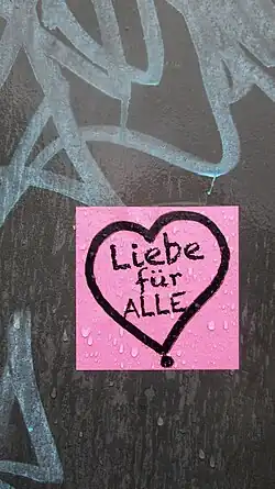 Aufkleber dürfen grundsätzlich nur auf eigenem Besitz angebracht werden. Aufkleber in der Öffentlichkeit können je nach Stadt und Art des Stickers als Sachbeschädigung oder Ordnungswidrigkeit ausgelegt werden. Oftmals kann jedoch der Verursacher nicht oder nur mit sehr hohem Aufwand herausgefunden werden, wodurch eine Art Duldung entsteht. Tabu sind Aufkleber, die die Verkehrssicherheit gefährden wie z. B. auf Ampelanlagen.[12]