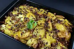 Ein Auflauf ist eine aus rohen und/oder vorgegarten Zutaten zusammengesetzte Speise, die mit eihaltiger Soße abgedeckt im Backofen gegart wird.[1] Aufläufe in kleinen Portionsförmchen können als warme Vorspeisen serviert werden.[2][3]