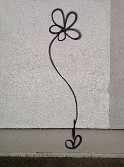 Die einfarbig schwarze Blume ist stark stilisiert. Sie hat einen langen, geschwungenen Stiel, fünf Blütenblätter und zwei kleine Blätter an der Basis des Stiels. Sie weist eine Ähnlichkeit zur Blume des New Yorker Streetart-Künstlers Michael De Feo auf, der seine fünfblättrige Blume mit geschwungenem Stiel (jedoch mit Blüteninnenkreis und pfeilförmigen „Fuß“, und auf Papier (paste up) statt direkt auf Wände und Objekte gesprüht) seit 1994 verwendet.[4]