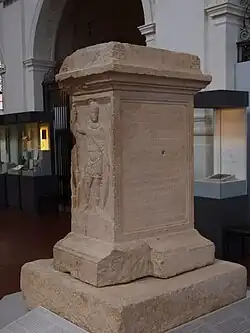 Wie oft in dieser Zeit hat man sich eines älteren Denkmals bedient: Von der ersten Verwendung zur Zeit des Severus Alexander (222–235 n. Chr.) stammt die Weiheformel für das Kaiserhaus oberhalb des eigentlichen Textfeldes, die erhalten bleiben konnte, weil sie unter einem Stülpdeckel verborgen war, ebenso wie Bearbeitungsspuren an den seitlichen Kehlen des Gesimses.