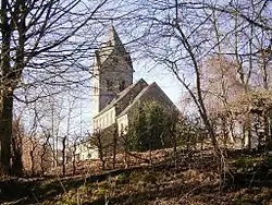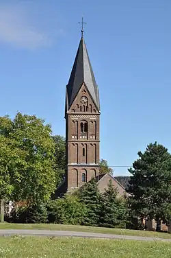 St. Amandus | Neubau | mehrere Entwürfe für unterschiedliche Standorte; durch gemeindeinterne Meinungsverschiedenheiten verzögerter Baubeginn (1883); einschiffige, neoromanische Kirche mit vorgelagertem Chor und ausgegliedertem Westturm mit spitzem Turmhelm; Fertigstellung 1884, Einbau der Innenausstattung 1885–1886; nach dem Zweiten Weltkrieg Veränderung Turmhelms[1]:370 ff. | |