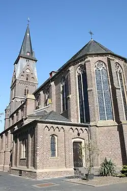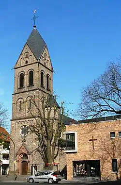 St. Suitbertus | Neubau | dreischiffige neoromanische Basilika mit Querhaus und dreiteiligem Staffelchor; aufgrund von Finanzierungsschwierigkeiten zunächst ohne Westturm, dieser erst 1894–1895 nach Plänen von Heinrich Krings errichtet; starke Beschädigung der Kirche während des Bombenangriffs am 31. Juli 1943, Wiederherstellung 1947[1]:359 ff. | |