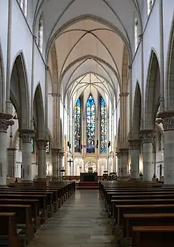 St. Servatius | Umbau | neuromanische, dreischiffige Stufenhalle, Neubau des vierten Jochs, der Sakristei, der Paramentenkammer und des Kirchturms; schwere Schäden im Zweiten Weltkrieg, notdürftige Instandsetzung Ende der 1940er Jahre, Neubau in den 1950er und 1960er Jahren[1]:167 ff. | |