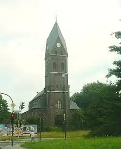 St. Rochus | Erweiterung | dreischiffige Hallenkirche mit zweischiffigem Querhaus in Backsteinmauerwerk, dem Langhaus vorgelagerter Westturm mit Rhombendach, aufgrund finanzieller Schwierigkeiten Baustopp von 1881 bis 1883, Fertigstellung nach Langes Tod 1884; schwere Schäden durch Bombentreffer 1942, 1943 und 1944; Neubau der Kirche unter Beibehaltung der von Lange konzipierten, erhaltenen Bauteile durch H. P. Fischer[1]:346 ff. | |