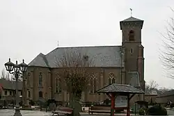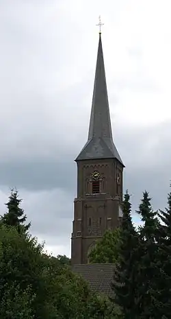 St. Antonius Eremit | Neubau | einschiffige Backsteinkirche mit Tür- und Fensterstöcken aus Werkstein; quadratischer dreigeschossiger Glockenturm mit achteckigem Turmhelm und einem Treppenturm im Westen; Altarmensa aus Savonnière-Kalkstein.[1]:253 ff. | |