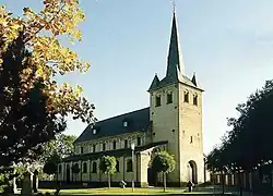 St. Laurentius | Umbau / Neubau | Entwurf 1873, Ende 1877/1878 überarbeitet, Bauausführung 1879/1880; dreischiffige, neoromanische Säulenbasilika mit Rundbogenfenstern aus Bruchsteinmauerwerk, achteckige pyramidale Turmspitze, flankiert von vier Türmchen, schließt am nördlichen Seitenschiff an den alten Kirchturm an, Neukonzeption südlicher Turm, beide Türme mit Blendgalerie versehen[1]:201 ff. | |