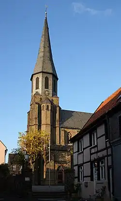 St. Martinus | Umbau / Neubau | dreischiffige, neoromanische Basilika unter Einbeziehung eines romanischen Kirchturms; ausgeführt in Ziegelmauerwerk mit Werkstein-Rundbogenfenstern, 1875 Abbruch der alten Kirche, Baumaßnahmen in mehreren Bauabschnitten; Ausführung des Turmhelms mit vier Spitzgiebeln, Innenausbau 1879–1894[1]:178 ff.[7] | |