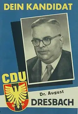 In der Weimarer Republik war Dresbach 1919 kurzzeitig Mitglied DNVP, ehe er der DVP beitrat. 1945 beteiligte er sich an der Gründung der CDU im Oberbergischen Kreis. Da er nie Mitglied der NSDAP war, wurde August Dresbach am 7. Mai 1945 von den Alliierten als Landrat des Oberbergischen Kreises eingesetzt. Ab 1946 war er ehrenamtlicher Landrat, legte das Amt allerdings am 14. November 1951 nieder. Er war von 1947 bis 1951 Vorsitzender des Landkreistages von Nordrhein-Westfalen und von 1949 bis 1951 Präsident des Deutschen Landkreistages.